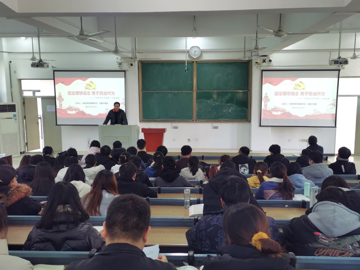 12月15日下午,在37棟1階梯教室,校黨委副書記劉建中教授以“堅定理想信念,勇于擔當作為”為主題,為材化學院全體學生黨員帶來了一場精彩生動的黨課,材化學院黨委書記童玉松主持。