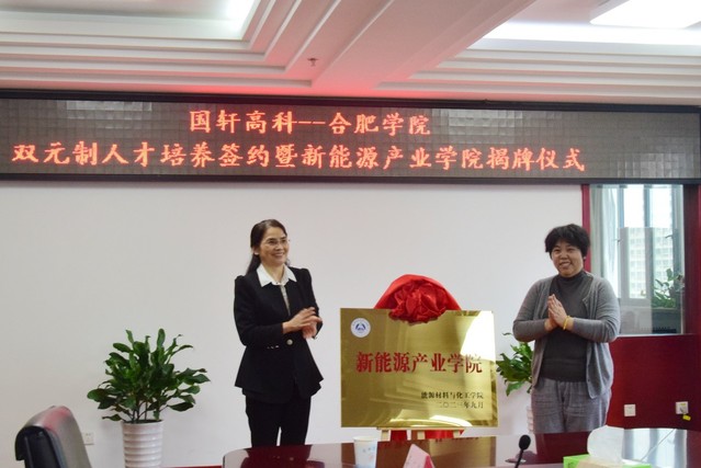 9月28日上午,合肥學院與國軒高科雙元制人才培養簽約暨新能源產業學院揭牌儀式在我校行政樓9樓東會議室召開。副校長陳秀、校黨委委員教務處處長王曉峰、研究生處副處長高大明、教務處副處長王仁寶、能源材料與化工學院黨委書記劉沛平、院長胡坤宏、副書記魏安樂、副院長鄧崇海和魯紅典、材料系主任秦廣超、副主任梁鑫等領導和部分老師作為學校代表參加了揭牌儀式,國軒高科董事長助理兼科技管理中心主任宋美、國軒高科科技發展部高級經理李冰心、國軒高科科技發展部項目主管趙龍等企業代表共同參加揭牌儀式,揭牌儀式由王曉峰處長主持。