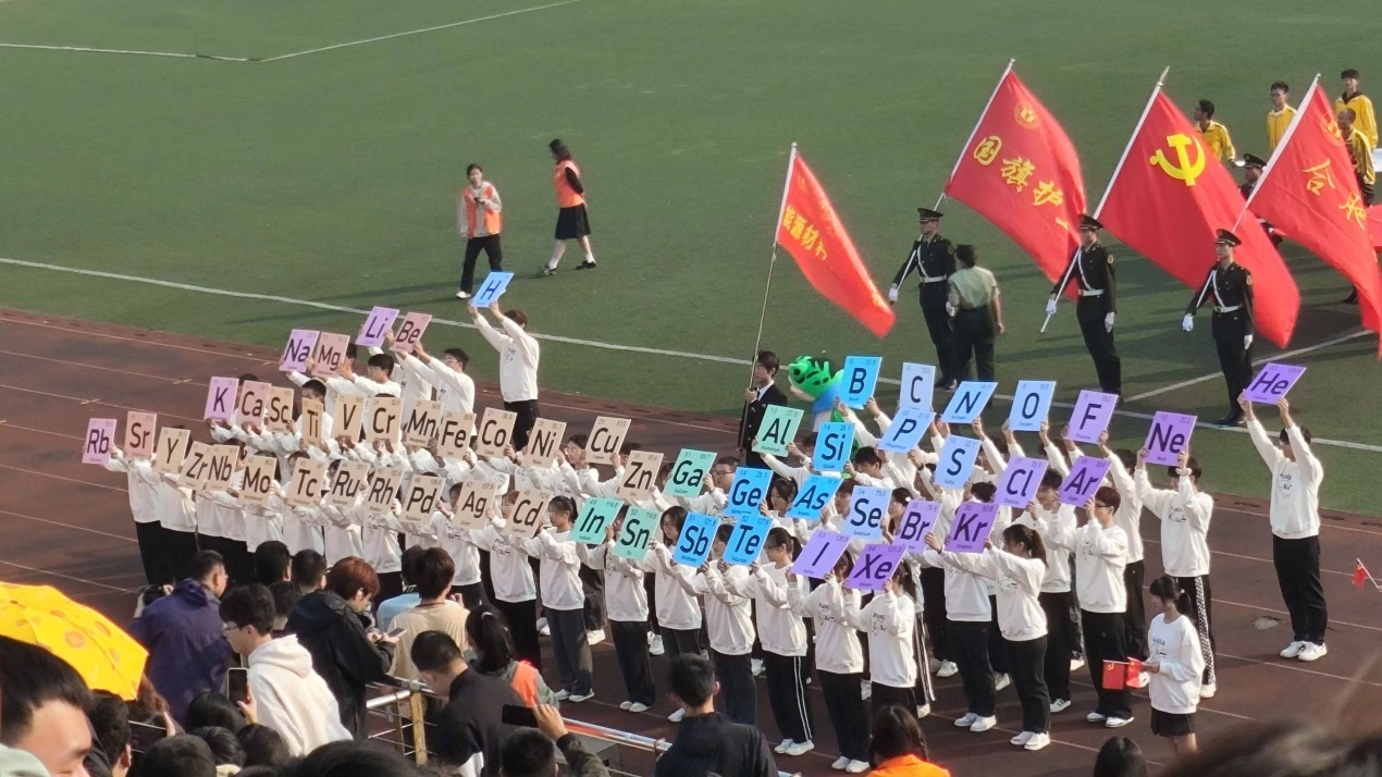 本屆運動會的開幕式在激昂的音樂聲中拉開了帷幕。學校領導、各學院師生代表以及來賓們齊聚一堂,共同見證了這一盛大的時刻。開幕式上,學校領導發表了熱情洋溢的講話,對本屆運動會的舉辦表示祝賀,并鼓勵同學們積極參與,展現風采。隨后,各學院的方陣隊伍依次入場,有序地進行了入場儀式,不僅展示了團結和奮進的精神,更是將本學院的特點完美體現,我院方陣以元素周期表的形式向大家展現,充分體現出了我院的專業特色,極具富有代表性。隨后更是有舞龍、國標舞、啦啦操等精彩的表演,再次將本次運動會推向了高潮,觀眾席上座無虛席,掌聲、喝彩聲不絕于耳。
