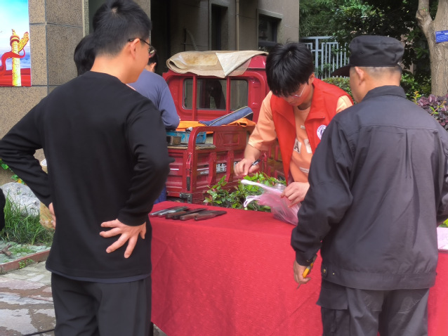 便民服務中的磨刀師傅是最受居民們喜歡,從早上8點半到中午11點師傅一刻都沒有停下來,志愿者幫助前來需要磨刀的居民們將刀寫上門牌號,以防拿錯。轄區居民們一邊等著磨刀,一邊饒有興致的討論磨刀訣竅。