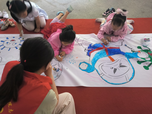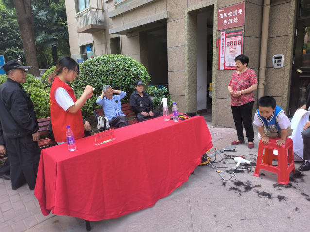 早上8點半,志愿小隊準時到達活動場地,在居委會老師的分配下,志愿小隊分為了4個部分,分別是便民義診、便民義剪、便民磨刀和引導小朋友們作畫。