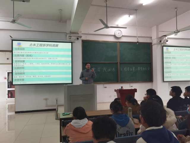 會(huì)議伊始,馬老師主要從學(xué)校辦學(xué)定位、實(shí)踐能力培養(yǎng)等多方面闡述了第二課堂的意義,并鼓勵(lì)各位同學(xué)積極參賽以提升自我專業(yè)能力。接下來,楊老師從競(jìng)賽目的、歷屆賽事、組織形式、獎(jiǎng)項(xiàng)設(shè)置等方面詳細(xì)介紹了大學(xué)生結(jié)構(gòu)設(shè)計(jì)競(jìng)賽和第六屆安徽省高校建筑信息模型(BIM)應(yīng)用競(jìng)賽;孫老師從歷屆賽事、比賽內(nèi)容、參賽對(duì)象等方面介紹了全國(guó)大學(xué)生結(jié)構(gòu)設(shè)計(jì)信息技術(shù)大賽相關(guān)事宜;姚老師主要解說了工程圖學(xué)競(jìng)賽的組織架構(gòu)、賽題等事宜;王老師從賽事流程、比賽規(guī)則等方面解說了周培源全國(guó)大學(xué)生力學(xué)競(jìng)賽。最后,馬老師重點(diǎn)介紹了測(cè)繪技能大賽相關(guān)事宜并做了簡(jiǎn)要總結(jié)。