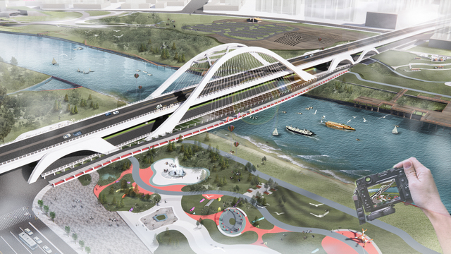 近半年以來,團隊成員與指導老師相互交流、團結協作,進行了方案設計、SketchUp建模、Lumion渲染和Midas有限元分析,解決了一個個技術難題,經過多次迭代完成作品。在設計中采用拱形鋼索雙層橋梁方案,既保障了橋梁的受力,又增添了美觀。橋梁上層與高架連接,加強與城際交通的聯系;下層與城市主干道連接,在增大交通量的同時,加強杭州市上城區和高新區的聯系。