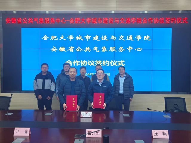 2024126日,合肥大學城市建設與交通學院黨委書記張永軍、副院長祝磊和安徽省智慧交通大數據分析與應用工程實驗室執行主任肖赟一行前往安徽省公共氣象服務中心開展科研項目交流,并舉行了產學研戰略合作簽約儀式。安徽省公共氣象服務中心主任苗開超,副主任江春,以及汪翔、周建平科長參加了簽約儀式。會議由省氣象公共服務中心主任苗開超主持。