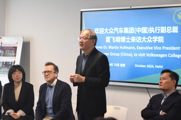 王其東對霍飛明一行表示熱烈歡迎。他表示,大眾學院是合肥大學與大眾汽車集團共建的服務地方經濟發(fā)展的示范性合作項目。當前,學校深入推進以大眾學院為首的雙元制現代產業(yè)學院建設,積極探索應用型人才培養(yǎng)新模式,希望雙方進一步加強溝通交流,在人才培養(yǎng)、科學研究等方面開展務實合作。霍飛明感謝學校的熱情接待,他表示大眾集團重視與合肥大學的合作,希望通過本次訪問加深對雙方合作項目的了解,進一步推動校企合作與人才培養(yǎng),為新能源汽車行業(yè)的發(fā)展培養(yǎng)更多優(yōu)秀人才。