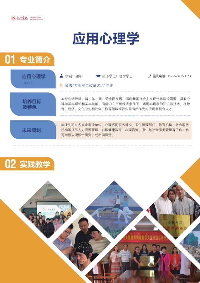 應用心理學(本科) 咨詢電話:0551-62159073 省級“專業綜合改革試點”專業 學 制:四年 授予學位:理學學士 培養目標及特色:本專業培養德智體美勞全面發展,適應我國社會主義現代化建設需要,具有心理學基本理論和基本技能,有能力在市場經濟條件下,運用心理學的知識與技術,在教育、經濟、文化衛生和社會工作等領域或行業里有所作為的應用型復合人才。 畢業生發展方向:畢業生可在各類企事業單位、心理咨詢服務機構、衛生管理部門、教育機構、社會服務機構等從事人力資源管理、心理健康教育、心理咨詢、衛生與社會服務管理等工作;也可繼續攻讀碩士研究生或出國深造。 |