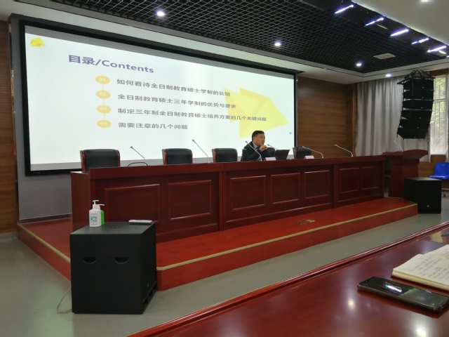 為深入推進學習貫徹習近平新時代中國特色社會主義思想主題教育落實落地取得成效,4月25日下午2點30分,沈陽師范大學博士生導師周潤智教授應邀來南艷湖校區一期6號樓報告廳為我校師生作了題為“全日制教育碩士培養方案解讀”的學術報告。報告會由教育學院和校科研處聯合舉辦,科研處副處長王儲炎主持報告會,教育學院領導班子全體成員、碩士點部分導師和該院師生代表近百余人聆聽了報告。