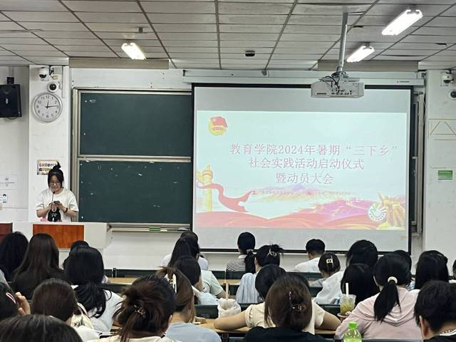 風好正揚帆,實踐須力行。為了響應國家鄉村振興戰略,號召和動員學院廣大師生積極參與社會實踐,用自身力量服務社會實踐,貢獻青春力量。6月19日中午12:10在三棟101教室舉行教育學院2024年暑期“三下鄉”社會實踐活動啟動儀式暨動員大會,標志著這一充滿青春活力和服務熱情的社會實踐活動正式拉開帷幕。出席這次大會的有教育學院黨委副書記王迅、團委副書記張弦樂,團委學生兼職副書記屠厚輝、李艾錦以及三下鄉重點團隊和實踐小組的成員。會議由組織部部長朱思宇主持。