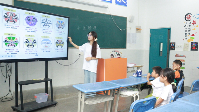 京劇臉譜繪丹青,色彩斑斕韻味濃。7月8日下午,合肥大學教育學院“同筑鄉村夢,共‘育’振興果”志愿服務隊在合肥市小廟鎮蜀山行知學校開展暑期“三下鄉”社會實踐活動,團隊成員郭艷寧為孩子們帶來了一節意趣盎然的京劇臉譜繪畫課。 一段唱腔,演繹千年故事;一抹臉譜,盡顯人間百態。臉譜作為京劇表演必備的道具,它不僅是演員的面具,更是中華文化的符號,映射出中華民族的智慧與精神。教師希望通過本次課程激發孩子們對中國優秀傳統文化的興趣,進而領略中華文化的精髓。 “猛聽得金鼓響畫角聲震,喚起我破天門壯志凌云…”課堂上教師由京劇經典曲目《穆桂英掛帥》引入,介紹了京劇臉譜的藝術特點:“每一筆勾勒、每一抹色彩,皆蘊含著角色的性格與命運。紅色象征忠勇,黑色代表剛毅,白色則暗示狡詐,金銀彰顯神秘。在光影流轉間,這些色彩賦予了角色鮮活的生命。”孩子們聽得如癡如醉。通過學習京劇臉譜的分類、特點、顏色、造型規律,孩子們深深感受到了中國京劇臉譜的獨特魅力。