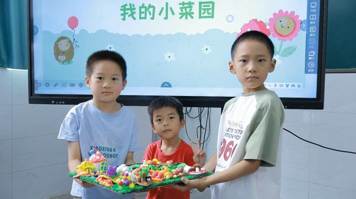 在小組合作中,同學們合理分工,積極溝通,相互配合,增進了彼此的了解和信任,體現了小組成員間的凝聚力與合作意識。七彩的粘土在同學們的手中變化,五顏六色的花朵、各式各樣的動物、形形色色的蔬菜紛紛呈現,匯成一幅美好的“菜園”圖景。在課程的最后,每個小組都收獲了心儀的“果園”,他們依次上臺展示成果,臉上洋溢著成功的喜悅。