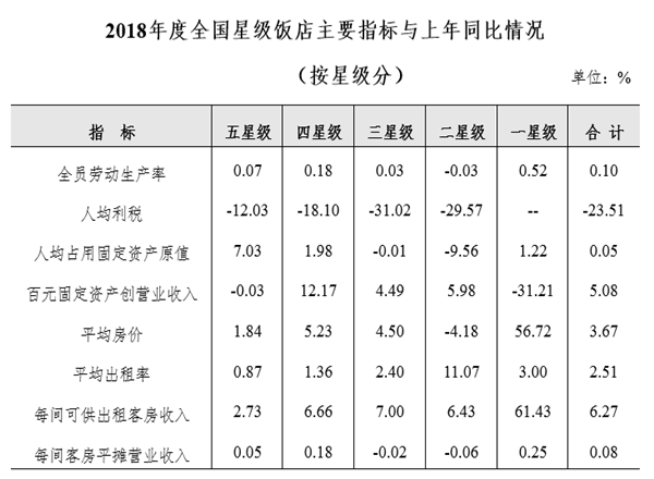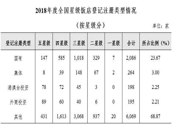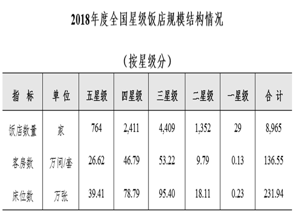 據(jù)中華人民共和國(guó)文化和旅游部發(fā)布的消息,截至2018年底,全國(guó)星級(jí)飯店統(tǒng)計(jì)管理系統(tǒng)中共有10249家星級(jí)飯店,其中一星級(jí)70家,二星級(jí)1844家,三星級(jí)4965家,四星級(jí)2527家,五星級(jí)843家。完成填報(bào)的為9994家,填報(bào)率為97.51%。