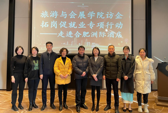 1月17日,合肥學院學工部副部長、就業指導中心主任張應杰、旅游與會展學院黨委書記黃雄英、院長宋玉軍、黨委副書記孫靜宇、副院長鄭嬗婷、教師陳丹、就業聯絡員董敏一行到合肥洲際大酒店進行走訪,開展“訪企拓崗促就業”專項行動,就深化校企合作、科研交流、人才培養以及促進畢業生就業等方面進行深入交流。洲際酒店人力資源部總監陳婕等對學院來訪表示熱烈歡迎。