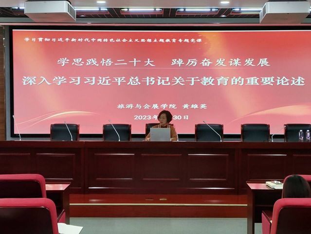 根據《旅游與會展學院學習貫徹習近平新時代中國特色社會主義思想主題教育理論學習工作安排》,5月30日下午,旅游與會展學院黨委書記黃雄英以“學思踐悟二十大 踔厲奮發謀發展---深入學習習近平總書記關于教育的重要論述”為主題,為全體師生黨員講授主題教育專題黨課。