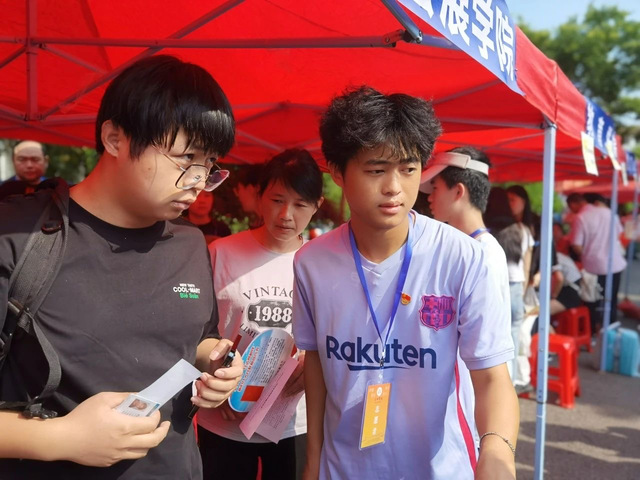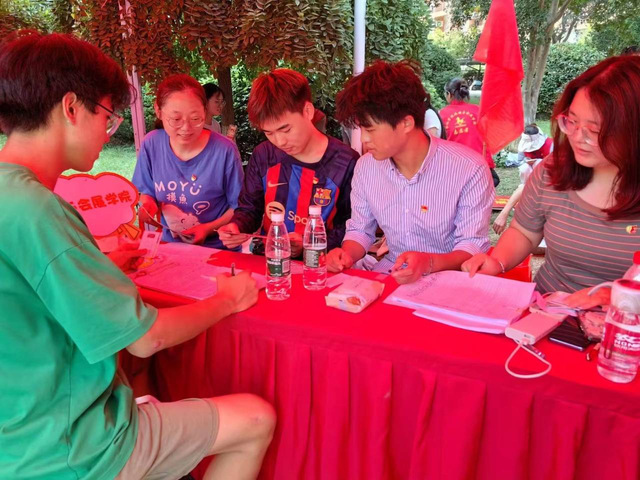 迎新現場,黨員志愿們分為報道和接待兩組,分別為新生服務。報道組詳細貼心地引導新生按照要求填寫信息并為學生答疑解惑;接待組引導新生辦理入住,介紹校園,親切叮囑入學注意事項,大家分工明確,有條不紊,迎新工作順利開展。時至中午,天氣炎熱,但志愿者們的工作熱情絲毫不減。盡管汗流浹背,但面對長途跋涉的新生,他們用熱情的笑容給新同學們留下了深刻的印象。
