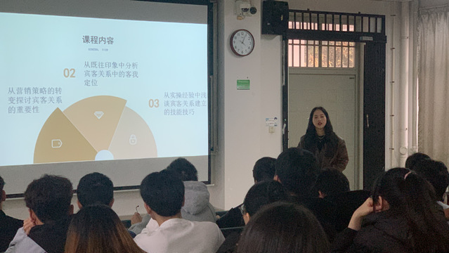 2023年11月14日,洲際酒店客戶關系主管何兆絲經理應邀為22級旅游管理和酒店管理專業學生開展了一場題為《客戶關系管理實務》的專題講座,高騰老師主持。此次講座是由《旅游接待業》教學團隊命題,學生們提出具體的細分問題,再由企業專家據此準備講座資料,旨在讓學生們更好地理解客戶關系管理的實際運作。