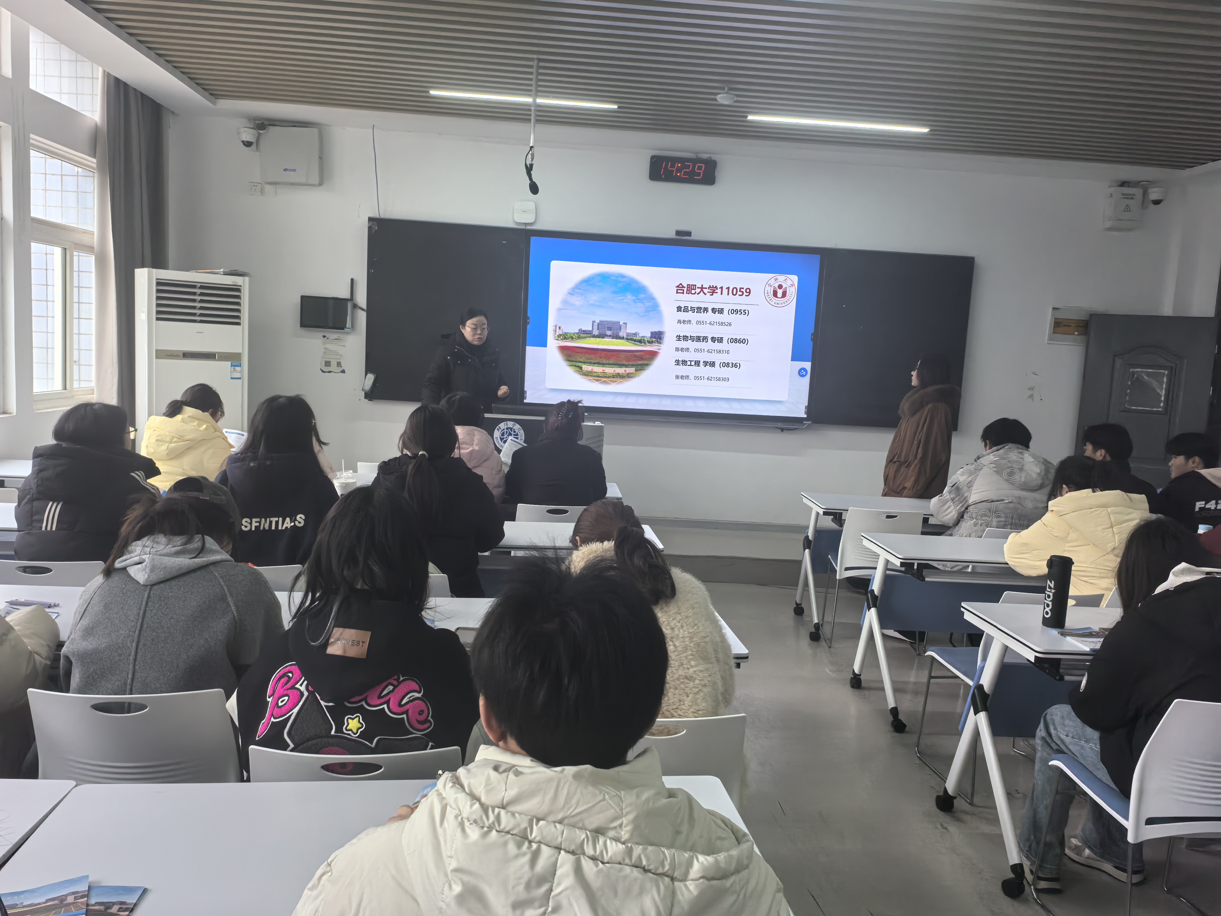 在蚌埠學院,食品與生物化工學院楊俊老師、土木與水利學院副院長朱蘭保和水利工程系黨支部書記潘爭偉接待并精心安排了宣講場所與參會學生,宣講對象主要為相關專業的大三和大四學生。在宣講過程中,環境與資源碩士點負責人劉曉薇從專業特色、科研項目及國際合作等方面進行了介紹,強調該專業在環境污染治理、資源循環利用及生態修復等前沿領域的研究優勢。食品營養與健康碩士點負責人肖青青詳細介紹了該專業的培養目標、課程設置、研究方向、招生計劃、科研項目成果及就業前景,并指出該專業緊密結合國家“健康中國”戰略需求,致力于培養復合型人才。此外,宣講團隊還詳細解讀了生物與醫藥和生物工程兩個專業的招生計劃、研究方向及培養模式,強調產學研結合和創新能力培養。