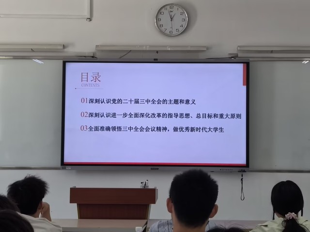 首先,李秀娟深入闡述了黨的二十屆三中全會(huì)的主題和重要意義。她指出,全會(huì)聚焦全面深化改革,明確了新時(shí)代改革的方向和任務(wù),為推動(dòng)國(guó)家發(fā)展提供了重要指引。她強(qiáng)調(diào),全會(huì)的指導(dǎo)思想是堅(jiān)持以習(xí)近平新時(shí)代中國(guó)特色社會(huì)主義思想為指導(dǎo),立足新發(fā)展階段,貫徹新發(fā)展理念,構(gòu)建新發(fā)展格局,推動(dòng)高質(zhì)量發(fā)展。隨后,李秀娟進(jìn)一步講解了全面深化改革的總目標(biāo)和重大原則。她指出,總目標(biāo)是完善和發(fā)展中國(guó)特色社會(huì)主義制度,推進(jìn)國(guó)家治理體系和治理能力現(xiàn)代化。同時(shí),改革必須堅(jiān)持黨對(duì)改革的集中統(tǒng)一領(lǐng)導(dǎo),堅(jiān)持改革沿著中國(guó)特色社會(huì)主義方向前進(jìn),堅(jiān)持社會(huì)主義市場(chǎng)經(jīng)濟(jì)改革方向,堅(jiān)持改革為了人民、依靠人民,這些原則為改革的順利推進(jìn)提供了堅(jiān)實(shí)保障。最后,李秀娟著重強(qiáng)調(diào)了大學(xué)生在貫徹落實(shí)黨的二十屆三中全會(huì)精神中的責(zé)任與使命,要深刻理解習(xí)近平總書(shū)記提出的“六個(gè)力”的豐富內(nèi)涵,即思政引領(lǐng)力、人才競(jìng)爭(zhēng)力、科技支撐力、民生保障力、社會(huì)協(xié)同力、國(guó)際影響力,要求全體需要圍繞這“六個(gè)力”深入思考,深刻領(lǐng)悟全會(huì)精神,將個(gè)人理想融入國(guó)家發(fā)展大局,努力學(xué)習(xí)科學(xué)文化知識(shí),提高自身綜合素質(zhì),積極投身社會(huì)實(shí)踐,為實(shí)現(xiàn)中國(guó)式現(xiàn)代化貢獻(xiàn)自己的力量。