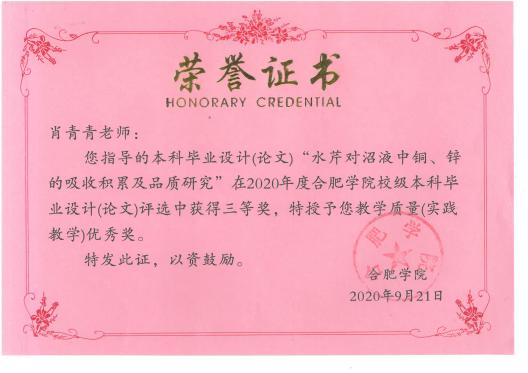 肖青青同志在科研工作方面緊密圍繞專業(yè)需求和發(fā)展,主要從事食品安全與農(nóng)業(yè)環(huán)境污染防治等方面的科研工作。主持完成國家自然科學(xué)基金青年基金項目1項、國家重點研發(fā)計劃子課題1項、安徽省自然科學(xué)基金青年基金項目1項、合肥市科技局對外合作借轉(zhuǎn)補項目、橫向校企合作項目1項、發(fā)表論文20篇(SCI論文5篇、中文論文4篇,其中中科院分區(qū)大類一區(qū)SCI論文2篇、CSCD論文1篇、中文核心期刊論文1篇)。授權(quán)實用新型專利5項、軟著6項、科技論文獲獎1項。