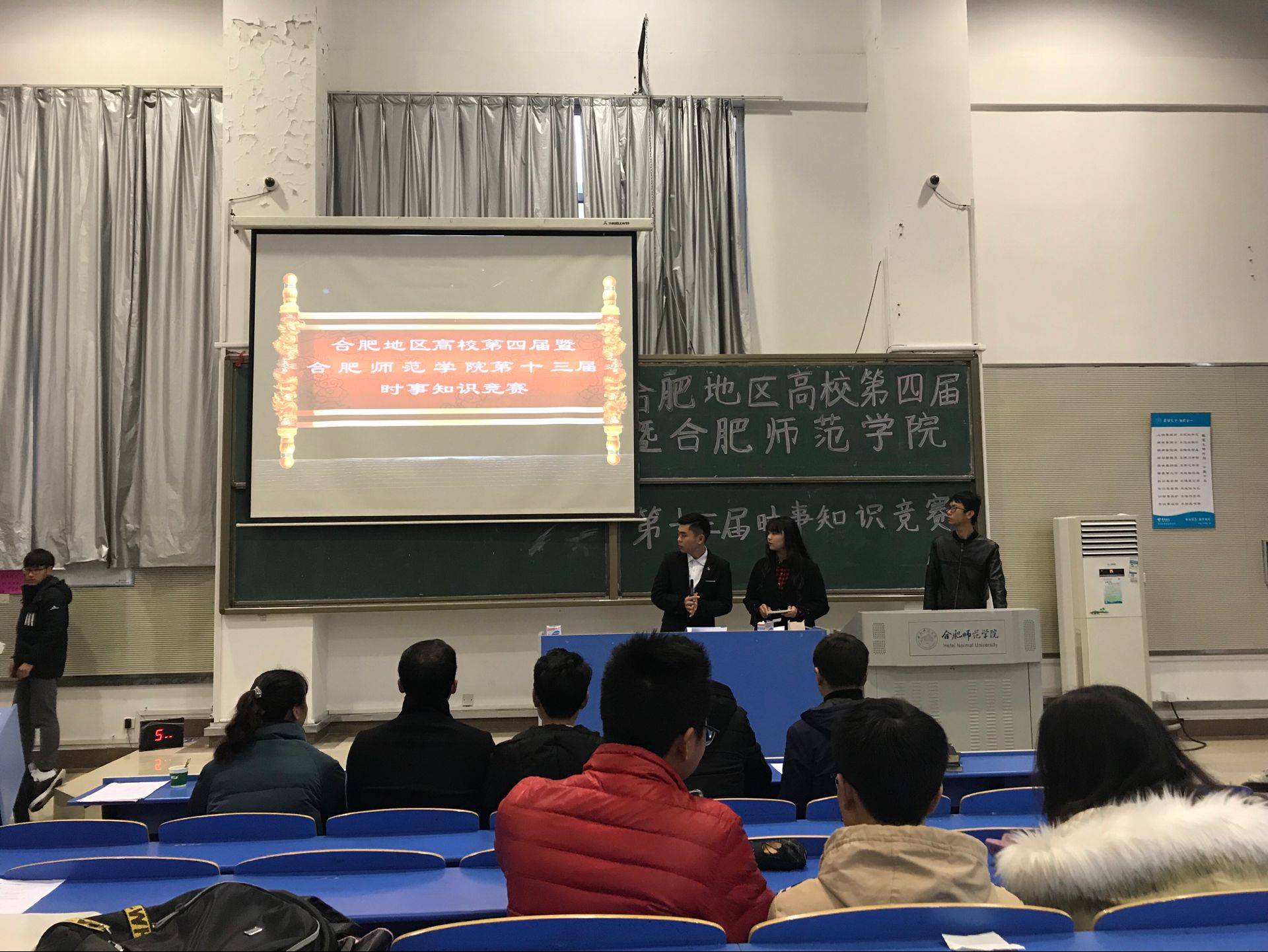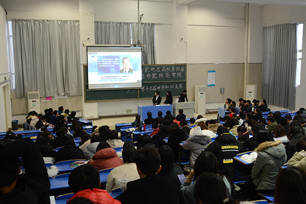 2017年12月23日,“合肥地區高校第三屆時事知識競賽暨黨的十九大知識競賽”在合肥師范學院舉行。來自安徽大學、安徽農業大學、合肥學院、合肥師范學院、安徽醫科大學等10多所高校理論社團的大學生參加了此次競賽。 比賽階段分必答題、搶答題、紅歌飛揚、指定作答4個環節,參賽選手時而熱烈討論、時而踴躍搶答,各代表隊展現出了青年學子的博識與風采,精彩的回答不時引發場下觀眾陣陣掌聲。合肥學院代表隊由中國化馬克思主義理論研究會社團成員組成,賽前得到了馬克思主義學院黃瑩瑩老師精心指導,葉云鵬、岳甫、郭躍、王麗、俞樹紅、王永誠和鄭楚俊同學組成的代表隊不畏強手,一路過關斬將,最終拔得頭籌。 本次知識競賽的舉辦,進一步激發了青年學子們學習宣傳貫徹黨的十九大精神的熱情,進一步激勵了同學們在新時代牢固樹立起時代的使命感、責任感和緊迫感,在實現中國夢的生動實踐中放飛青春夢想。 2018年12月22日上午,合肥地區高校第四屆暨合肥師范學院第十三屆時事知識競賽在合肥師范學院錦繡校區逸夫樓舉行。安徽大學、安徽農業大學、合肥學院、安徽三聯學院、安徽職業技術學院、合肥師范學院等6所高校思想理論類學生社團代表隊參加比賽,合肥師范學院團委負責人、各二級學院學生代表近300人到場觀賽。