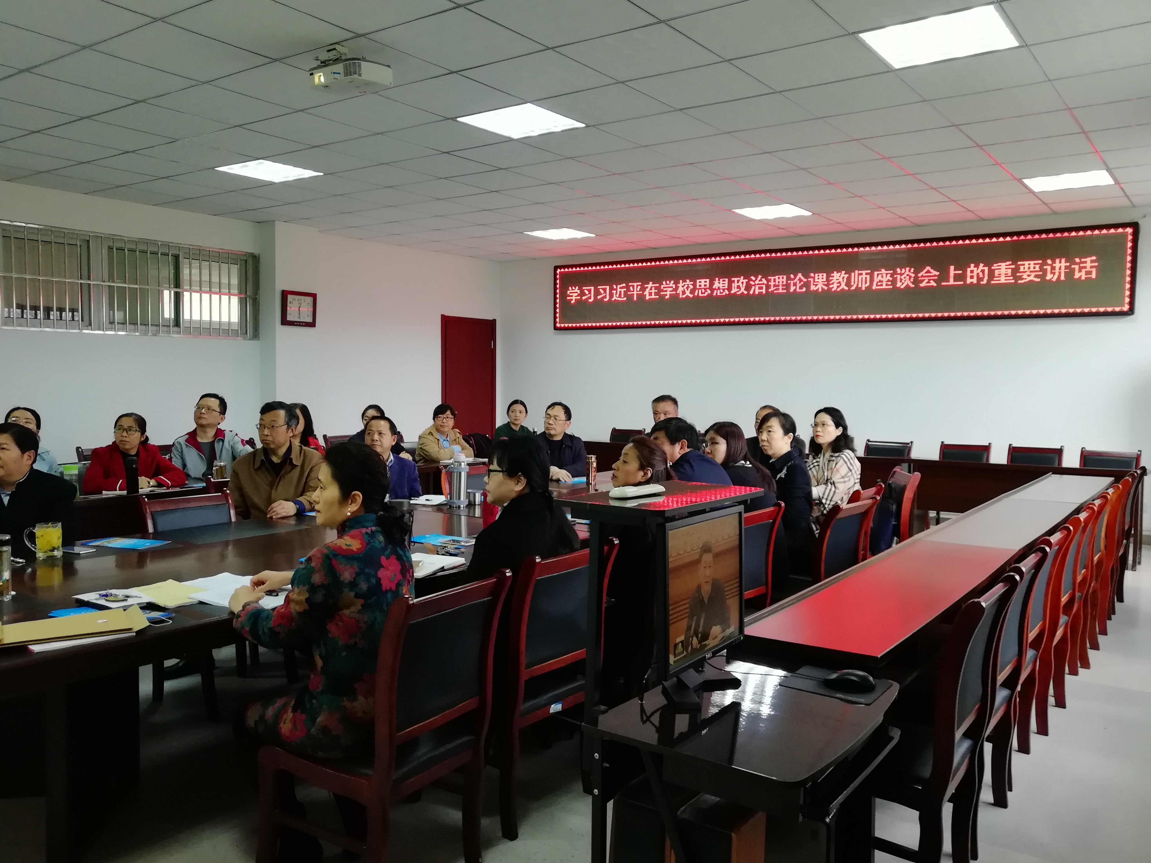 與會人員首先觀看了習近平總書記在學校思想政治教師座談會上的重要講話視頻。胡艷萍院長說:3月18日習近平主持召開學校思想政治理論課教師座談會并發表重要講話,這樣的座談會由黨中央來召開是建國以來第一次。總書記著眼世界百年未有之大變局與黨和國家事業發展全局,結合教書育人規律和學生成長需求,直面當前思政課建設面臨的突出矛盾,對一些長期困擾一線教師的理論和現實問題作出鞭辟入里的分析。從堅定信仰到樹立信心,從感染學生到贏得學生,習近平總書記為我們上了一堂特殊而難忘的思政課。