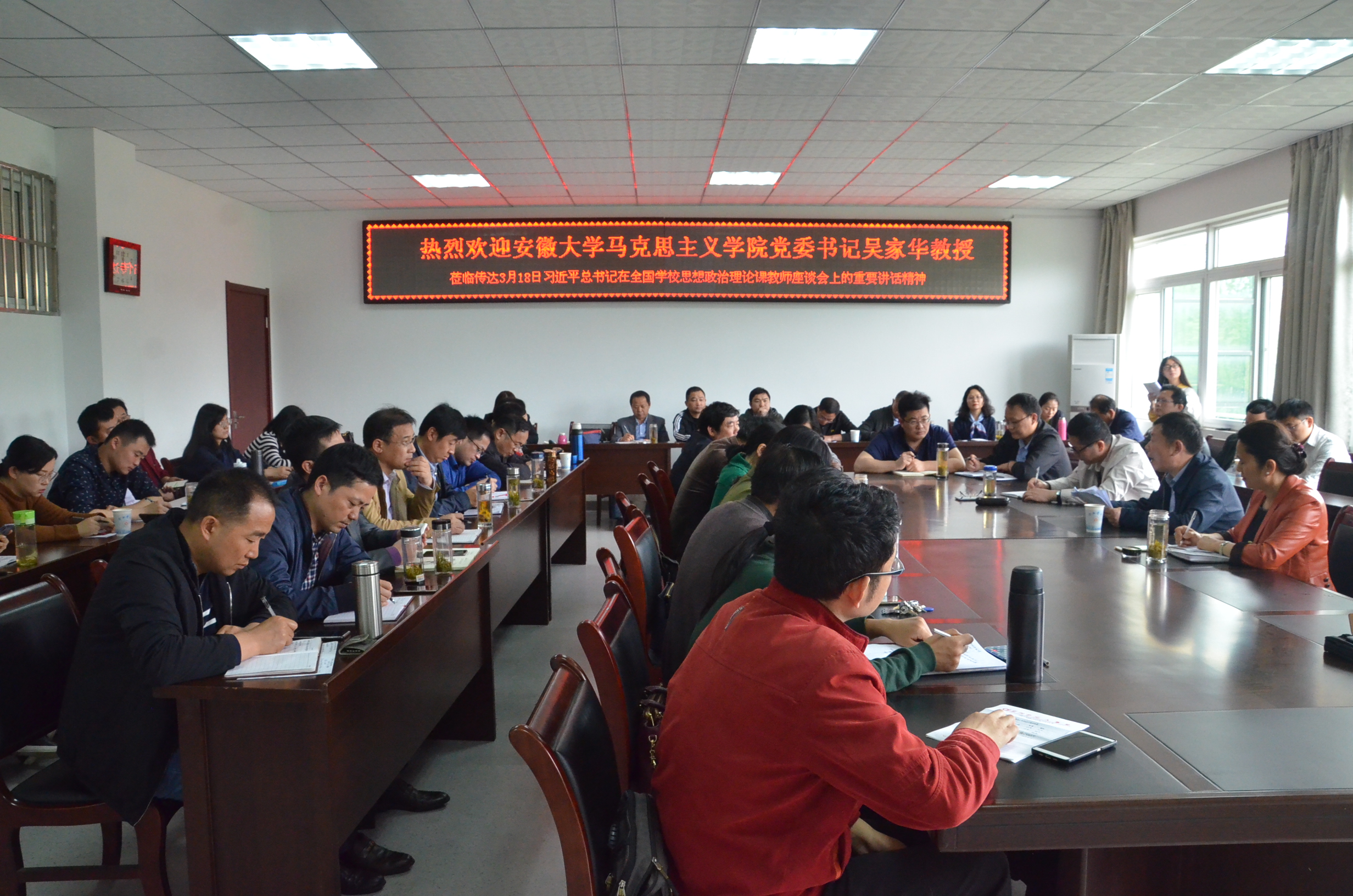 | 4月23日,安徽大學(xué)馬克思主義學(xué)院黨委書記吳家華教授來訪我校馬克思主義學(xué)院,傳達(dá)習(xí)近平總書記在學(xué)校思想政治理論課教師座談會(huì)上的重要講話精神。校黨委委員、副校長劉建中,思政課全體專兼任老師50多人出席會(huì)議,會(huì)議由馬克思主義學(xué)院院長胡艷萍主持。 會(huì)議伊始,胡艷萍對(duì)吳家華的到來表示熱烈歡迎。她簡單介紹了學(xué)校馬克思主義學(xué)院教師隊(duì)伍的基本情況,并表示希望吳家華書記在傳達(dá)總書記重要講話精神的同時(shí),可以結(jié)合安徽大學(xué)馬克思主義學(xué)院教學(xué)實(shí)踐,對(duì)我校的思政課教學(xué)提出指導(dǎo)性建議。