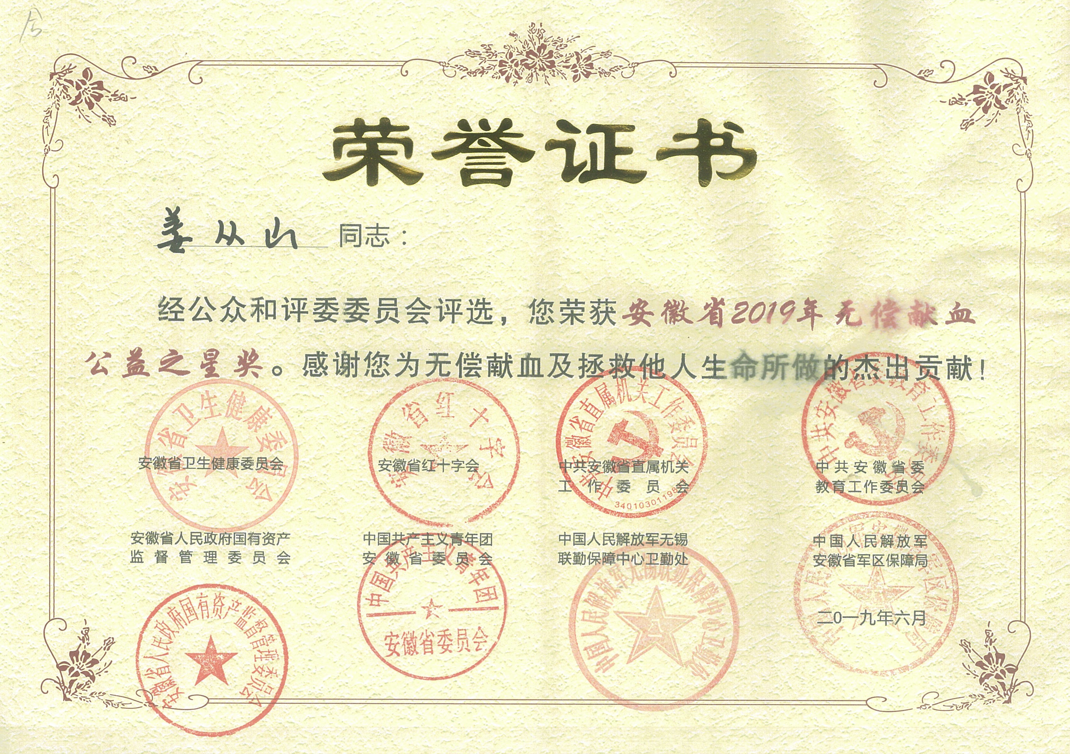 | 合肥學(xué)院網(wǎng):姜從山老師獲安徽省2019年“無償獻(xiàn)血公益之星”2019-06-18 |