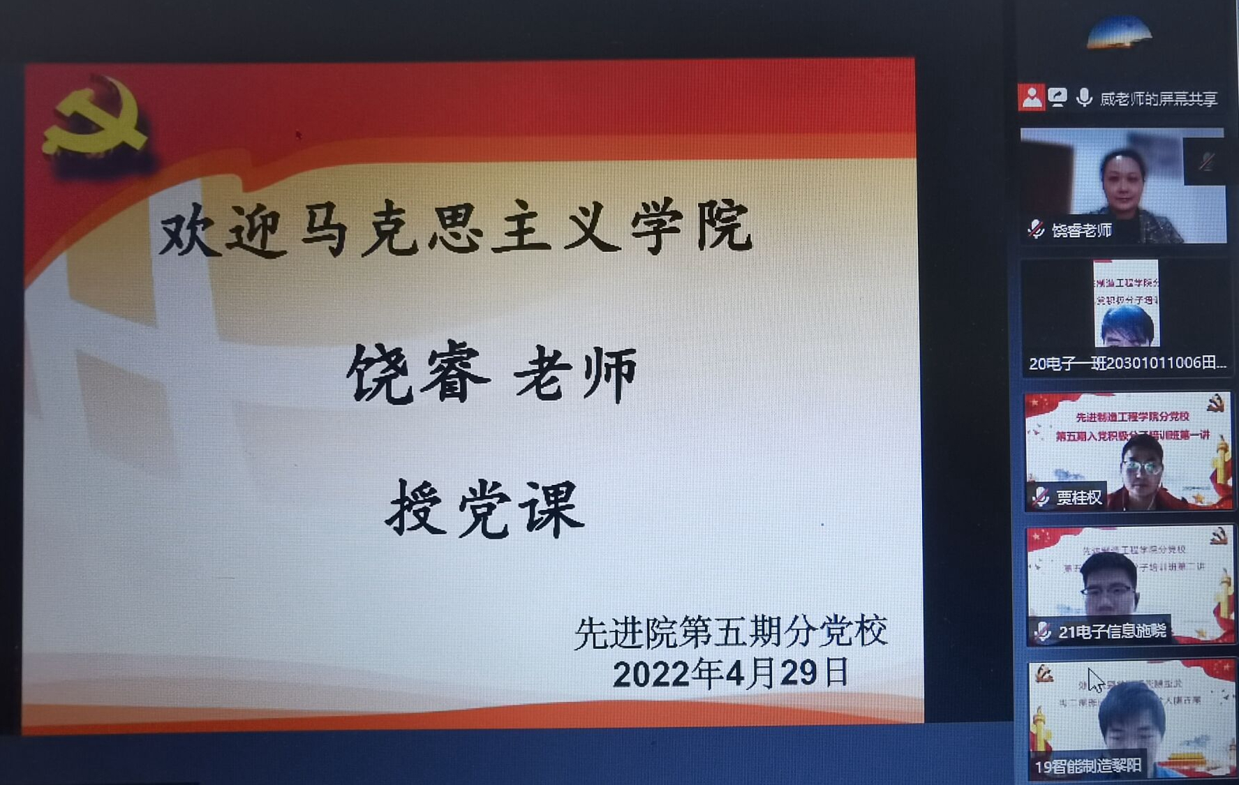 2022年4月29日中午,先進(jìn)制造工程學(xué)院分黨校入黨積極分子培訓(xùn)班通過騰訊會(huì)議平臺(tái)開展了第二次黨課教學(xué)。本次黨課由馬克思主義學(xué)院饒睿老師進(jìn)行授課、機(jī)制學(xué)生黨支部書記威力旺老師主持,先進(jìn)制造工程學(xué)院分黨校第五期入黨積極分子班共124名學(xué)員參加了本次課程。本次授課主題為“中國共產(chǎn)黨為什么能”。