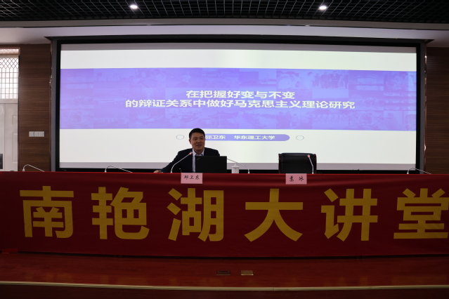 我院舉辦“做好馬克思主義理論研究”南艷湖大講堂學(xué)術(shù)報(bào)告 3月15日下午,由科研處、馬克思主義學(xué)院共同主辦的南艷湖大講堂學(xué)術(shù)報(bào)告在一期6號(hào)樓報(bào)告廳舉行。特邀華東理工大學(xué)馬克思主義學(xué)院副院長(zhǎng)邱衛(wèi)東教授作題為“在把握好變與不變的辯證關(guān)系中做好馬克思主義理論研究”的學(xué)術(shù)講座。講座由馬克思主義學(xué)院直屬黨支部書記、副院長(zhǎng)蘇冰教授主持。全體思政課教師與部分學(xué)生共100余人參與此次報(bào)告會(huì)。