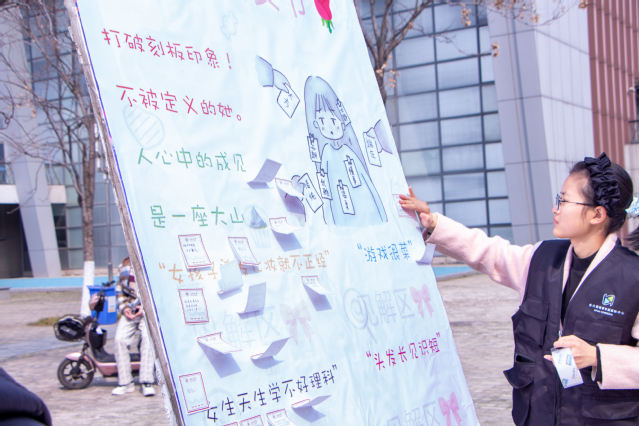 活動當天,工作人員提前做好準備,活動現場精心布置,吸引了眾多師生駐足參與。活動利用展牌展示了當今社會中對女性的一些偏見和觀念束縛。參與者們通過在便簽上書寫自己的想法并貼到展牌上,表達對自我的認同與支持。這種互動形式不僅讓參與者得到溫暖和鼓勵,也為在場的每一個人帶來了力量此外,活動現場還準備了豐富的文創禮品,進一步激發了師生們的參與熱情。文創禮品與活動主題緊密結合,成為傳播活動理念的載體,吸引了更多人關注女性權益與多元價值。