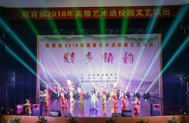 11月14日晚由安徽省教育廳主辦、合肥學(xué)院承辦的“鼓鄉(xiāng)情韻——高雅藝術(shù)進(jìn)校園在一區(qū)致用禮堂傾情上演。合肥學(xué)院黨委委員、副校長劉建中,滁州學(xué)院黨委常委、副校長吳開華,合肥學(xué)院團(tuán)委書記杜娟,滁州學(xué)院音樂學(xué)院副院長彭鈺,滁州學(xué)院團(tuán)委副書記庚老師以及來自各系的一千多名同學(xué)觀看了本場演出。本次活動以“高雅藝術(shù)進(jìn)校園——鼓鄉(xiāng)情韻”為主題展開,旨在陶冶學(xué)生情操,傳播愛國主義思想。