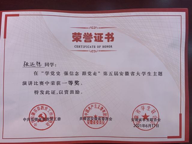 在黨的百年華誕即將到來之際,第五屆安徽省大學生主題演講比賽在我校舉行,是安徽省教育工委、團省委對我校工作的肯定,也是對我校黨史學習教育效果的中期檢驗,同時還是對我校組織活動能力的一次考驗。經過省委黨史教育領導小組辦公室指導,團省委學校部協助籌辦,大賽圓滿落幕,本次大賽既是一場演講比賽,更是一堂深刻的青春思政課,引領著全校學生從重溫輝煌百年黨史中激發信仰、獲得啟發、汲取力量,不斷增強“四個自信”,繼承紅色基因,努力做到學史明理、學史增信、學史崇德、學史力行。