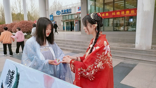 320日起,漢宣社的同學們每晚相聚辦公室,為花朝節(jié)的舉辦進行相關準備活動。心靈手巧的她們發(fā)揮各自想象力,結合傳統的剪紙、結繩等方式,做出了各種紙折花朵以及彩繩,作為花朝節(jié)活動小禮品。325日,漢宣社同學們身著漢服,相聚二期食堂門口,給前來參與活動的同學宣講花朝節(jié)的小故事,并贈送紙折花、花神書簽等;路過的同學們通過參與飛花令、猜字謎等游戲獲得相應的小禮品。我社精心制作展板宣傳,穿戴漢服做好妝造,準備漂亮的折紙花和手繩手鏈送予路過的同學們。吸引了不少同學們,在百花誕辰共歡慶。