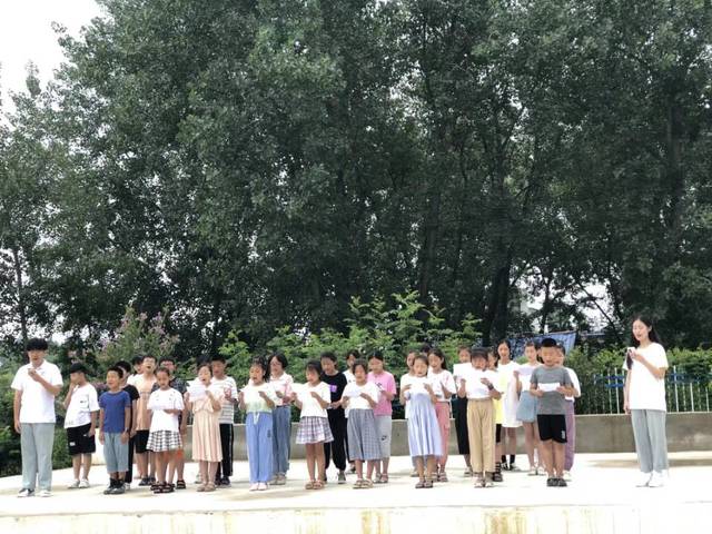 早上7:00,志愿團隊到達丁集鎮中心小學,在操場上為7月19日的文藝匯演進行彩排。結束后,志愿者們在規定時間內吃完早飯。