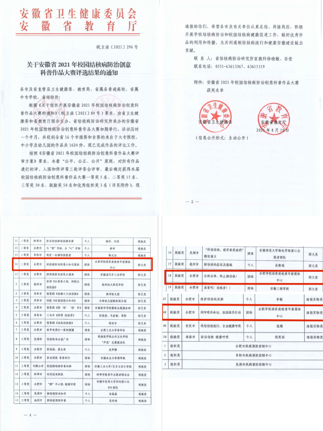 近日,由安徽省衛生健康委員會和安徽省教育廳聯合舉辦的安徽省2021年校園結核病防治創意科普作品大賽評選結果公布。我校學子創作的參賽作品榮獲二等獎1項、鼓勵獎2項