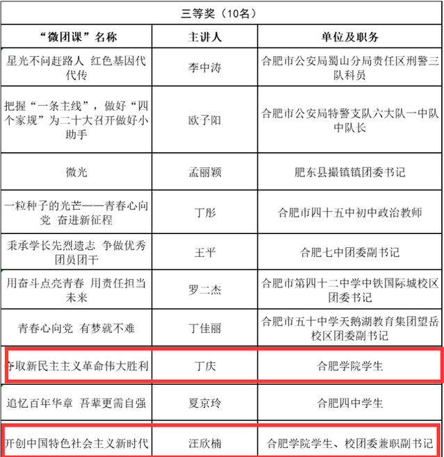 為迎接和學習宣傳貫徹黨的二十大,慶祝中國共產主義青年團成立100周年,激勵廣大團員青年砥礪前行、展示青春風采,共青團合肥市委圍繞“喜迎二十大、永遠跟黨走、奮進新征程”主題,組織開展了優秀微團課評選活動。近日,評選結果公布,我校2件學生作品榮獲三等獎。