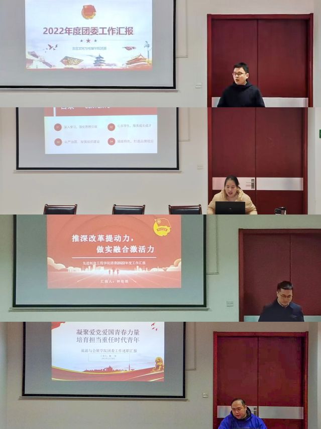 11個學院團委負責人現場述職,結合年度重點任務和工作目標,圍繞引領力、組織力、服務力和貢獻度四個方面展開匯報,總結成績、凝練品牌、反思不足,交流了今后的工作思路和改進措施。各學院團委堅持從嚴治團和深化改革,2022年度工作特點鮮明。人工智能與大數據學院通過舉辦“萌新杯”、大數據與人工智能應用、數獨深度游等科技類競賽以賽促學,以賽提能;外國語學院發揮多語言教學優勢,開展外語類話劇、演講、誦讀大賽激發大學生學習熱情;能源材料與化工學院聚焦學院黨建帶頭和共青團優勢,堅持黨團共建服務學生;經濟與管理學院持續夯實基層團支部建設,選樹優秀典型,發揮榜樣引領作用;教育學院積極打造電子課件設計大賽、特色短劇等師范生品牌活動;城市建設與交通學院緊扣“做青年學生的貼心人”為師生辦實事,提升共青團服務力;生物食品與環境學院統籌學科、社團資源,搭建創新創業聯動平臺;語言文化與傳媒學院以“紅色經典誦讀大會”等主題教育活動為載體,凝聚青年理想信念;先進制造工程學院著力打造網絡媒體平臺,宣傳教育工作提質提量,社會實踐成效顯著,暑期“三下鄉”實踐活動受到合肥晚報、安徽衛視等媒體報道;旅游與會展學院不斷提升實踐育人成效,協助安徽省腫瘤防治所開展三個“防癌”主題系列活動;設計學院為山區設計農產品包裝和文化導覽圖,將專業特長與助農助民結合,助力鄉村振興。