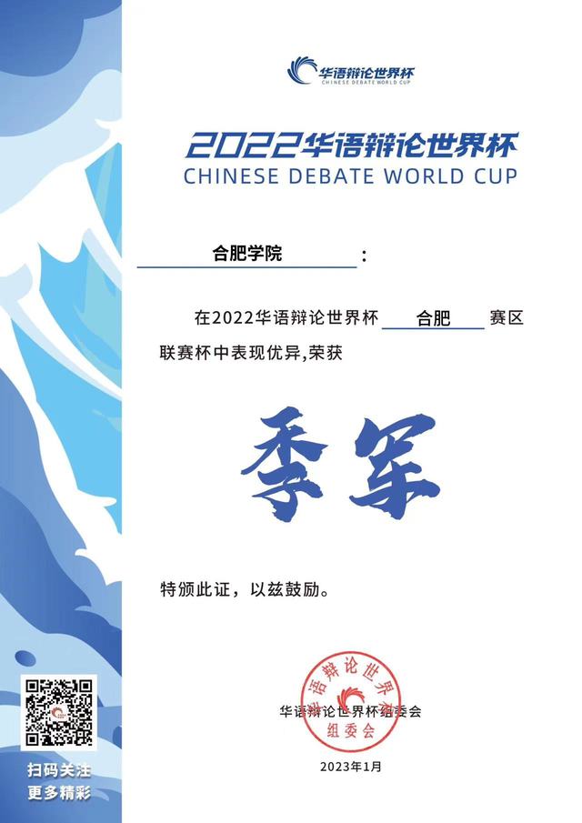 近日,2022年華語辯論世界杯合肥賽區排名揭曉,我校辯論隊榮獲季軍。