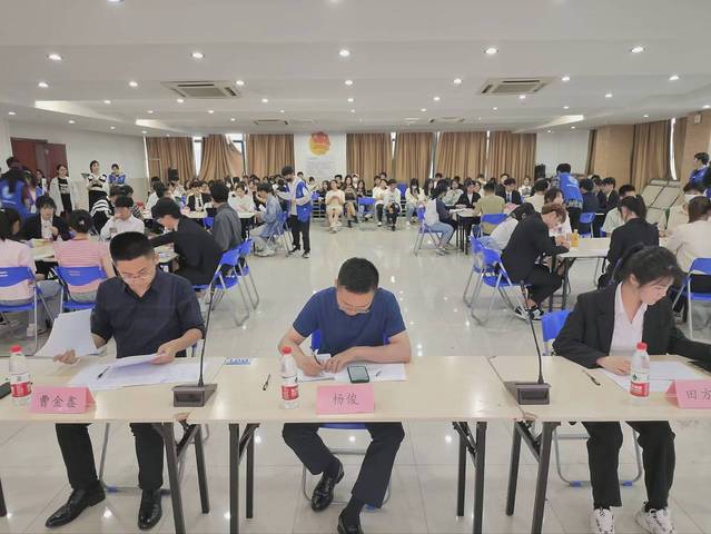 大賽分為兩個環節,一是無領導小組討論,二是模擬面試。選手通過抽簽分為4組,根據指定命題進行了30分鐘的小組討論。在此期間,各小組激烈討論,踴躍發言,進行了精彩的“頭腦風暴”,上演了一場激烈的“唇槍舌劍”,充分展現了選手們在組織協調、表達及邏輯思維等方面的能力。評委們在旁聽過程中給予選手針對性的指導,發散選手的思維,推進了比賽進程。討論結束后,組內推選出一名選手作小組總結發言,并通過匿名打分每組推選出3位得分最高的選手進入了下一輪模擬面試。