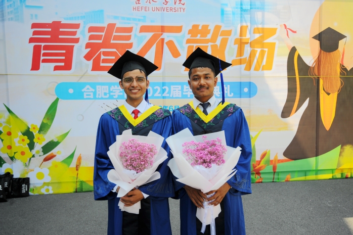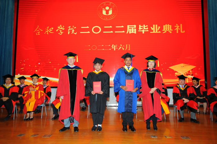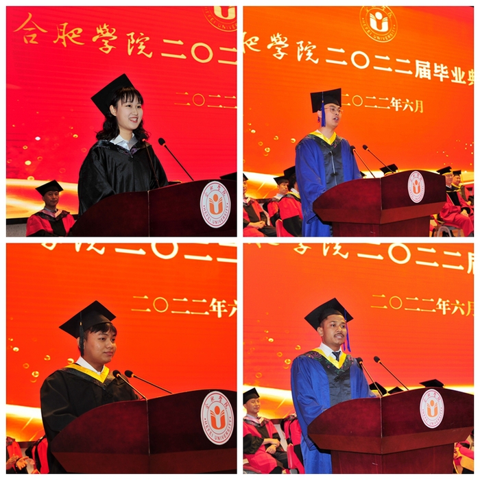 本科畢業(yè)生代表湯慶君、留學(xué)生畢業(yè)生代表鐘進意、研究生畢業(yè)生代表陸宏宇、研究生留學(xué)生代表尼德拉、教師代表胡坤宏教授相繼發(fā)言。湯慶君回顧了在大學(xué)四年里與同學(xué)、老師、合院相伴相成長的過程,她表示,會牢記國家和社會賦予的歷史使命,投身社會,奉獻(xiàn)青春,實現(xiàn)自我。鐘進意回憶并講述了他的中國故事、他的合院故事,并表示會讓更多的人了解中國,為中國和柬埔寨的友好交流貢獻(xiàn)自己的力量。陸宏宇回望三年研究生時光并對學(xué)校、老師和學(xué)校工作人員致以敬意,他說道:“三年1000多個日日夜夜的不懈拼搏與努力終于在2022風(fēng)吹麥浪的季節(jié)里結(jié)出了豐碩的果實。這些沉甸的收獲,寶貴的財富,無疑使我們在未來的學(xué)習(xí)、工作與生活中更多了一份信心和勇氣,助力我們成就更加精彩的人生。”尼德拉在發(fā)言中對給予他幫助與支持的同學(xué)、老師和家人表達(dá)真摯的感謝,在合肥學(xué)院,他感受到了家的溫暖。胡坤宏在發(fā)言中激勵畢業(yè)生繼續(xù)奮斗,勇攀科技文化高峰,為祖國建設(shè)奉獻(xiàn)力量,助推“中國夢”的實現(xiàn)。
