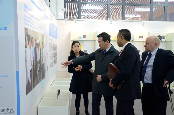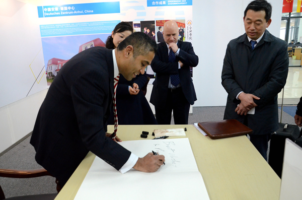 期間,英國德比市代表團一行參觀了中德共建合肥學院三十周年成果展。張文兵從合肥學院發展狀況、國際化合作以及中德合作專業學術交流等方面介紹了我校的整體情況,以及中外師生交流、文化交流、科研合作、專業共建等多類合作項目開展情況。拉杰·邦威在留言臺寫下對合肥學院的衷心祝福。
