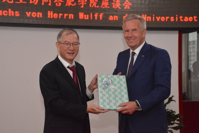 武爾夫深情回憶了安徽省與德國下薩克森州結為友好省州的合作歷史,以及歷次來訪合肥學院的切身感受。他表示,近年來,中德合作越來越密切,尤其是中德青年學子之間的互動日漸頻繁,希望雙方繼續深入交流,互信互鑒、互利發展,預祝大眾學院這一創新性的中德合作辦學模式能夠取得更大的成功。