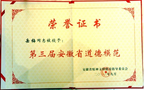 929下午,省委書記張寶順在合肥稻香樓賓館親切會見了第四屆全國道德模范及提名獎獲得者、第三屆全省道德模范。我校碩士生導師岳梅教授榮獲安徽省第三屆道德模范孝老愛親道德模范稱號,當日她作為安徽省唯一獲得此項殊榮的高校教師接受表彰。岳梅教授2008年曾榮獲合肥市先進工作者稱號,2011年獲第六屆合肥市十大杰出母親稱號。