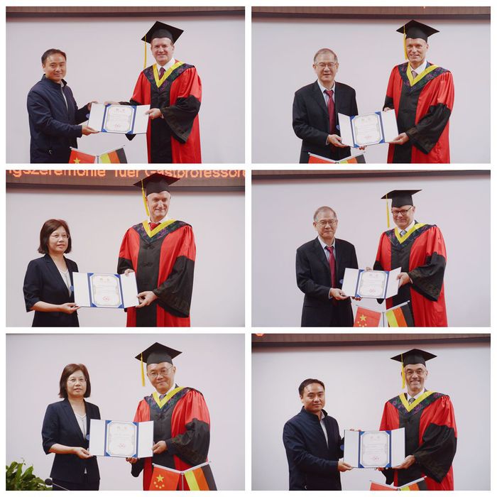 謝超、王其東、吳春梅為葛皖鏑博士等六位客座教授頒發證書。