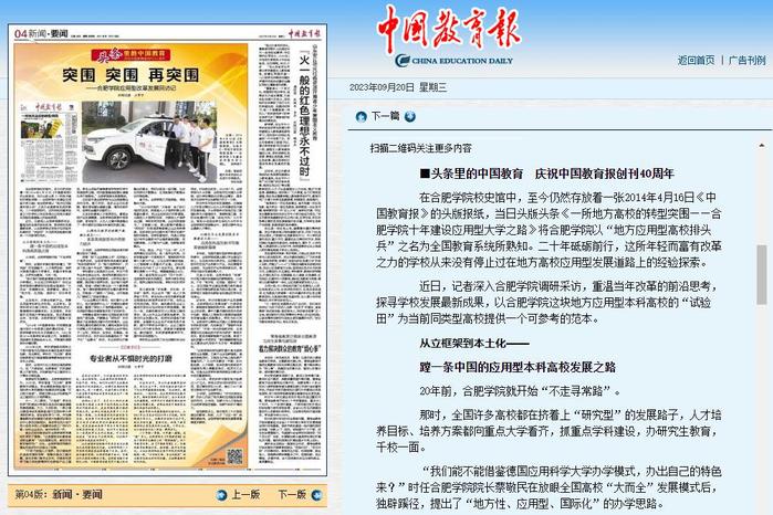 在合肥學院校史館中,至今仍然存放著一張2014年4月16日《中國教育報》的頭版報紙,當日頭版頭條《一所地方高校的轉型突圍——合肥學院十年建設應用型大學之路》將合肥學院以“地方應用型高校排頭兵”之名為全國教育系統所熟知。二十年砥礪前行,這所年輕而富有改革之力的學校從來沒有停止過在地方高校應用型發展道路上的經驗探索。