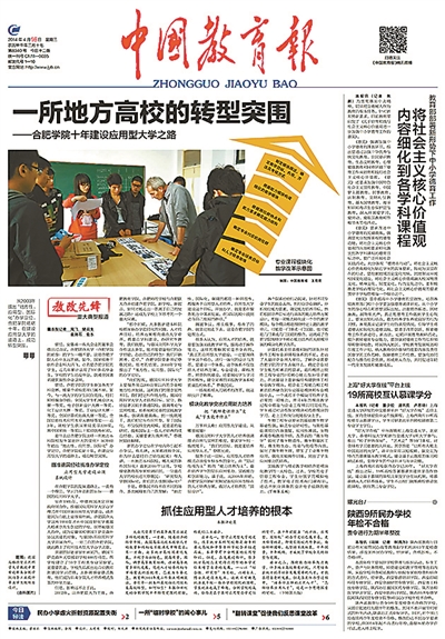 2014年4月16日《中國教育報》頭版版面圖,頭條為《一所地方高校的轉型突圍——合肥學院十年建設應用型大學之路》。資料圖片