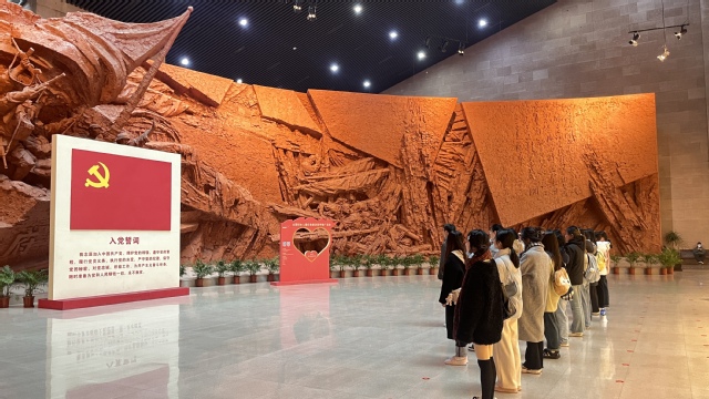 紀念館內,支部書記帶領全體黨員面向鮮紅黨旗宣讀了入黨誓詞。大家舉起右拳,一字一句地宣讀誓詞,聲音堅定有力,新發展黨員也通過宣誓進一步了解黨員責任和使命。