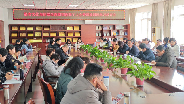 2月18日,語言文化與傳媒學院在五棟二樓會議室舉行了期初全體教職工大會暨師德師風學習教育會,學院領導班子成員及全體教職工參加會議。