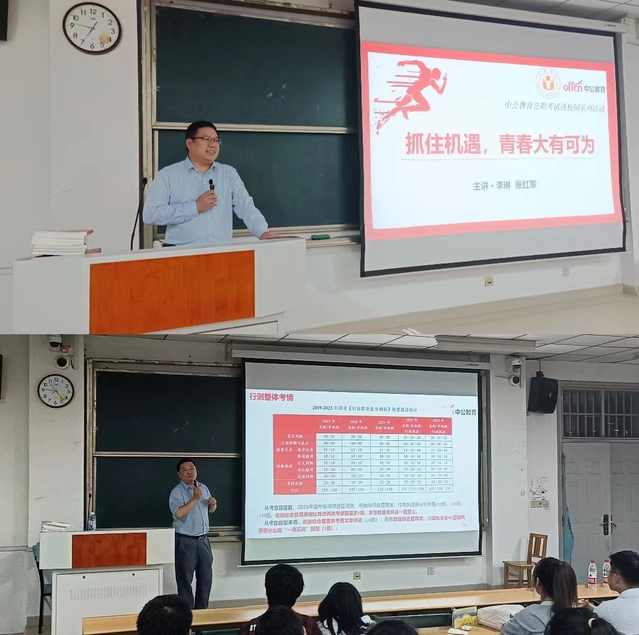 本次講座從三個方面進行展開,李琳首先向各位同學介紹了當前的就業形勢與公考改革。隨著社會的不斷發展和經濟的持續增長,大學生群體也不斷擴大,就業競爭愈加激烈,大學生就業形勢并不樂觀。李琳就公考改革做出了一些針對性建議,以便同學們更好地進行職業選擇。接著,他與同學們分享了申論題型應試技巧。他列舉了申論中的典型題型,在場同學積極舉手互動并交流自己的想法,反響熱烈。隨后,由張紅軍就行測題型應試技巧進行講解。他從學習方法及考試技巧等多方面與同學們進行分享,他通過分析經典例題與大家積極互動,同學們受益匪淺。