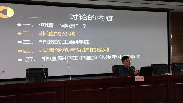 講座圍繞非遺文化的價值和傳承意義展開,程教授用大量生動的案例和圖片講述“非遺”的由來、類別和特征,呈現“非遺”的獨特魅力、保護原則和在中國文化傳承中的意義,并結合自身經歷,闡述非遺文化傳承的重要性,提醒同學們傳承非遺,時不我待。