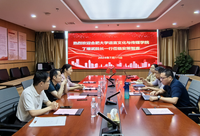 在合肥大學副校長張思揚的指導下,7月11日下午,語言文化與傳媒學院院長丁增武一行赴安策智庫開展訪企拓崗活動。安策智庫創始人陳丹、指導專家袁文長、董辦組織發展總督導李娟,語言文化與傳媒學院黨委副書記張愛萍、副院長殷明明、中文系主任洪婧等參加。
